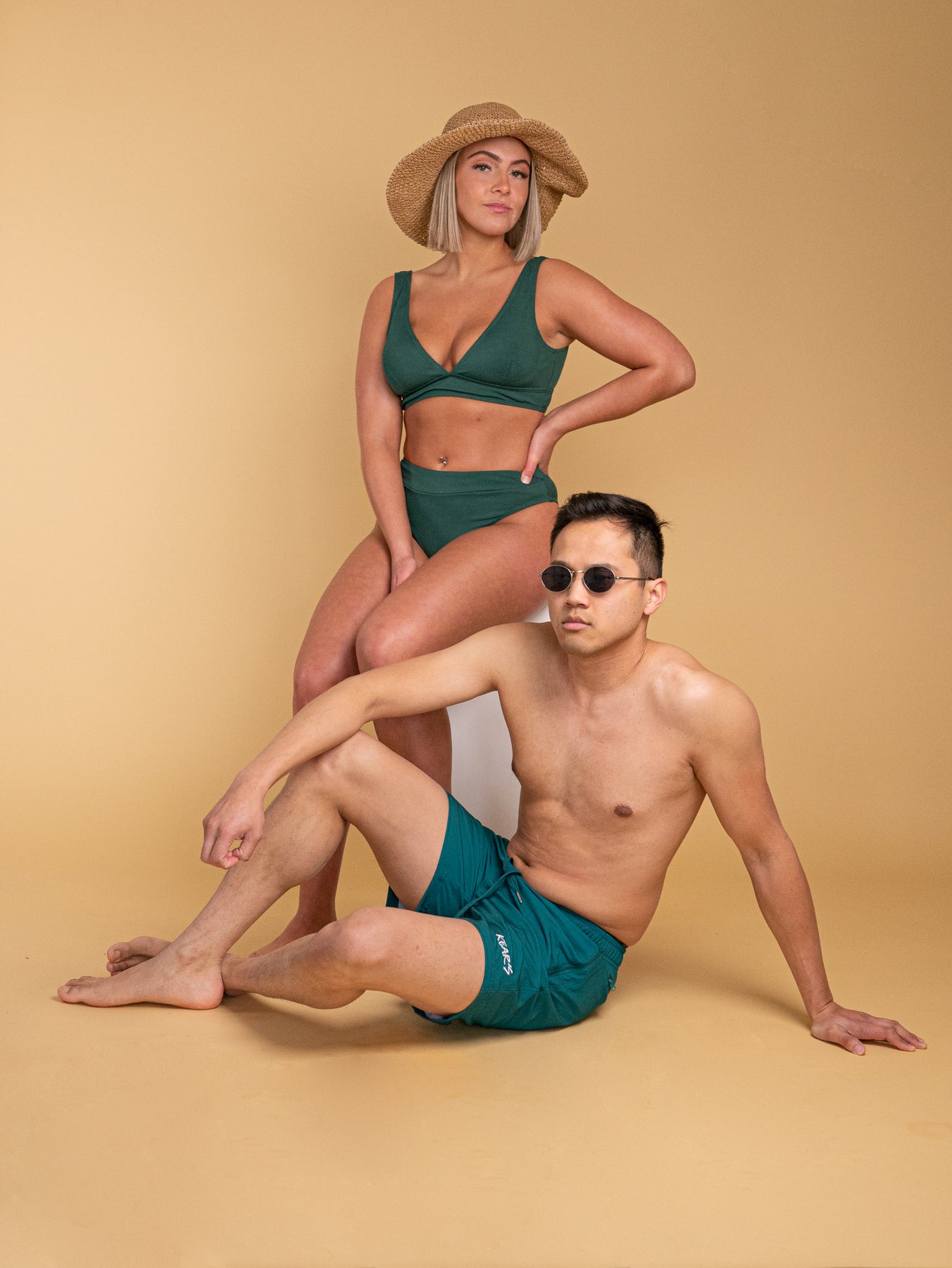 • The second model (with long hair) is wearing a medium top and large bottom