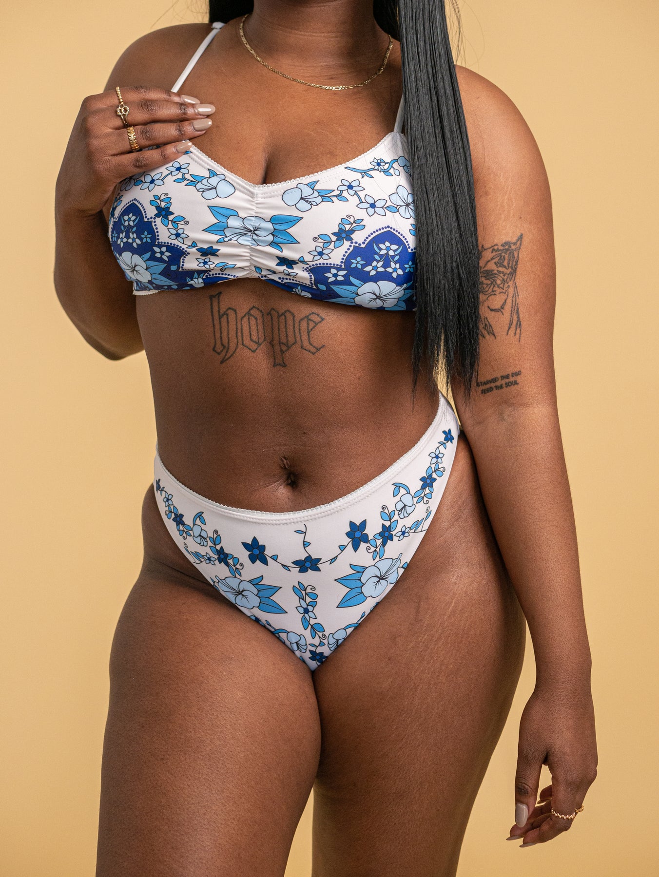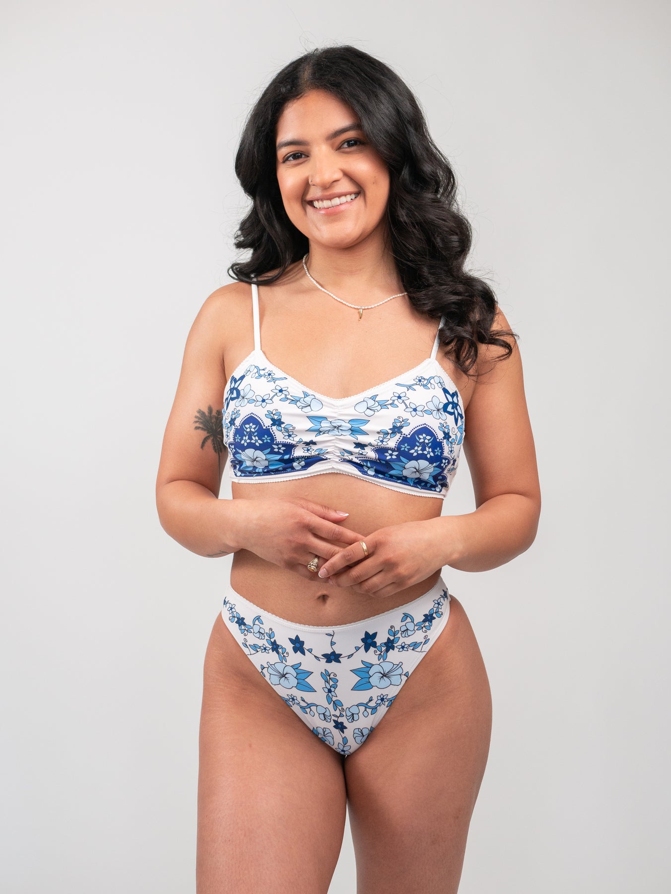 • The first model is wearing a medium top and small bottom